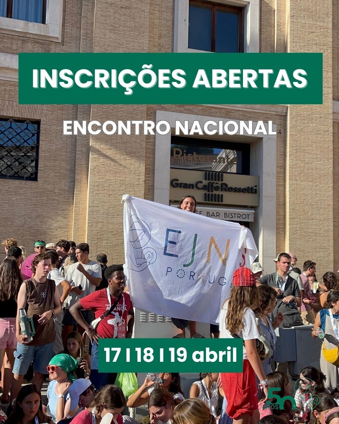 As EJNS fazem 50 anos e convidamos-te para celebrar connosco! Dia 31 de Maio, às 12h encontramo-nos na Quinta da Melhorada, Azinhaga para um grande almoço, missa e várias surpresas! Como sempre, espera-nos um dia cheio de histórias, bons encontros e diversão. Não podes mesmo faltar! Contamos com todos!